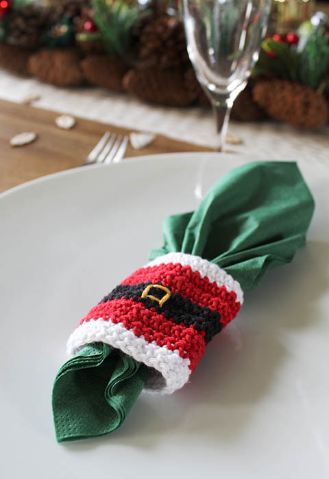 Apportez une touche de magie artisanale à votre table de réveillon : un élégant sapin décoratif sur socle en bois et de charmants ronds de serviette à l’effigie du Père Noël.